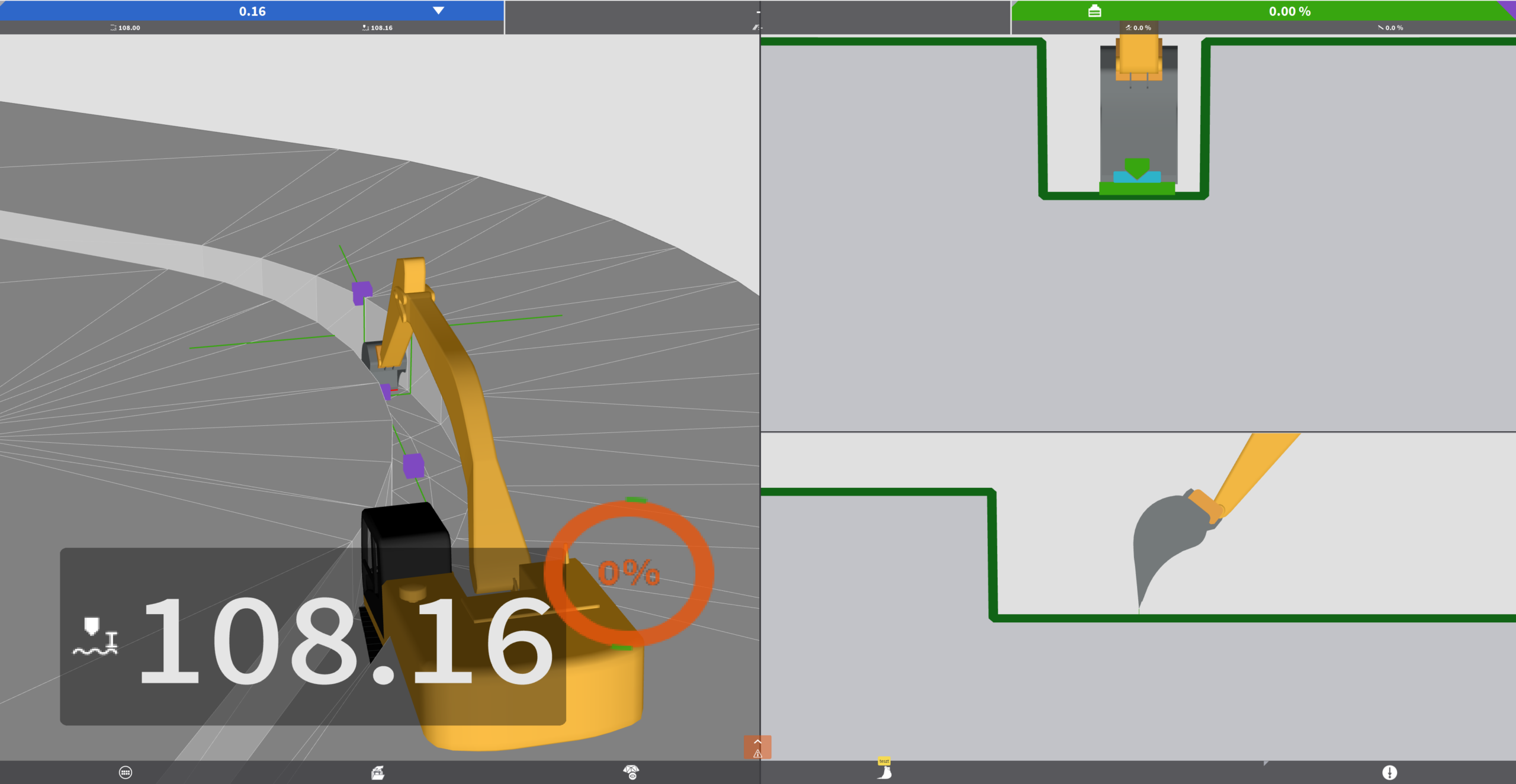 A Leica gépvezérlő panelon megjelenik az importált 3D terepmodell, valamint a munkagép és kiválasztott szerelék is. A Leica 3D rendszere összeveti a terepmodellt és a pillanatnyi 3D pozícióját a szereléknek és számítja a kettő közti eltérést, amelyet jól láthatóan és egyértelműen megjelenít. A gépkezelő feladata, hogy a terv és szerelék közti eltérést nullára redukálja, azaz, hogy a gémszerkezetet a 3D terepmodellen mozgassa.