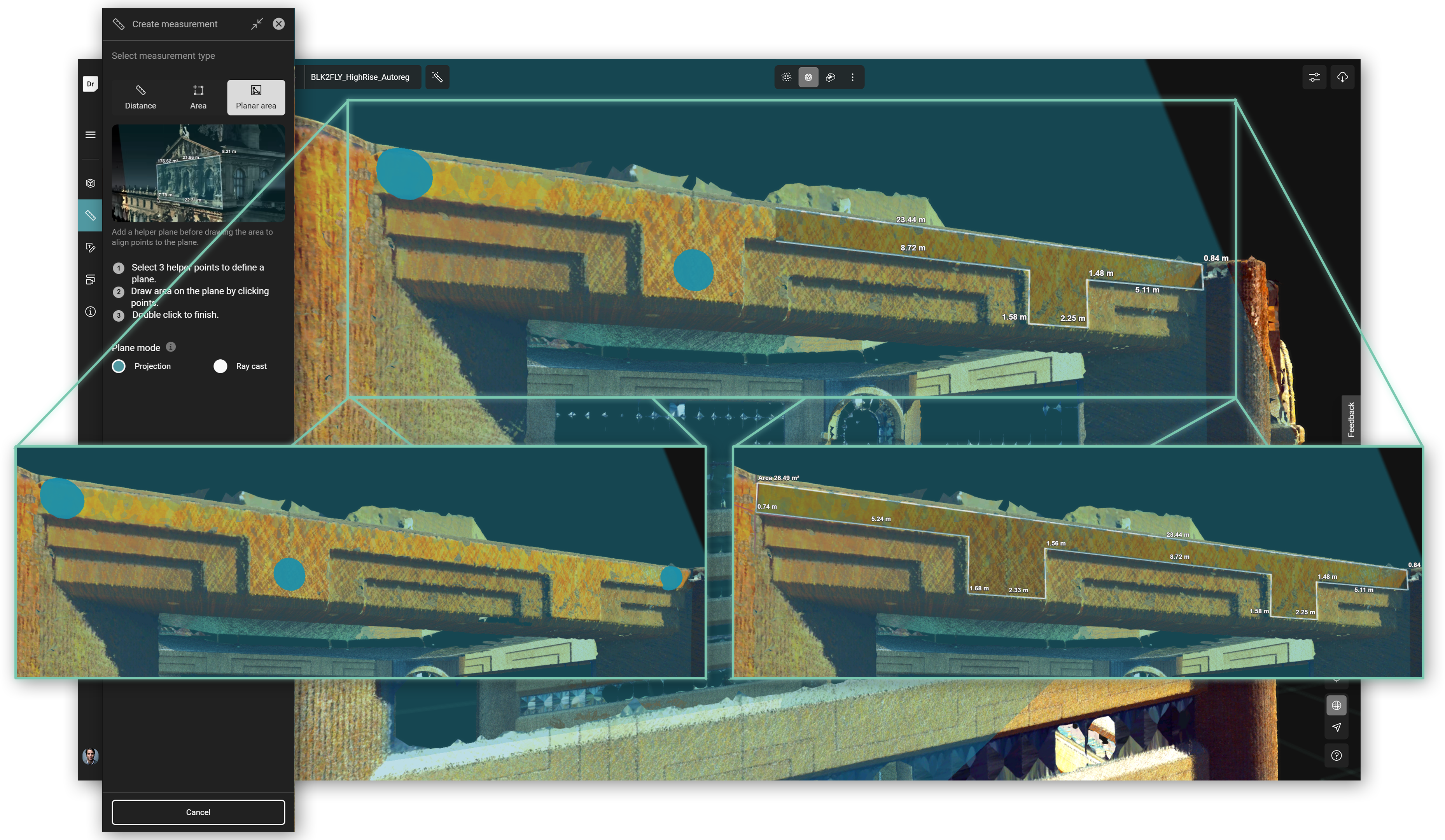 A feltöltött pontfelhőkben nem csak „nézelődni” van lehetőségünk, hanem akár távolság, vagy terület méreteket is le tudunk venni. Ehhez nagy segítség tud lenni a limit box funkció, amivel be tudjuk határolni a megjeleníteni kívánt területrészt vagy metszeteket is beállíthatunk. Ezeket, valamint a méreteket is el tudjuk menteni, így később újra fel tudjuk használni, egyszerűen előhívhatók.
